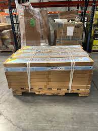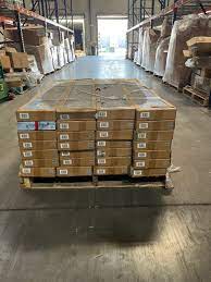 Packaged cartoon boxes are neatly stacked on the pallets.